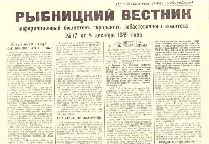 24 августа 1989 г. вышел первый номер бюллетеня «Бастующий Тирасполь». В его подготовке активно участвовали В.А. Лесниченко, Д.Ф. Кондратович, А.З. Волкова. Вначале тираж бюллетеня составлял всего 3 тыс. экземпляров, затем был увеличен до 25 тыс., а позже – до 40 тыс. экземпляров. Так, в период по- литической забастовки в МССР в августе–сентябре 1989 г. родилась новая свободная пресса Приднестровья. «Бастующий Тирасполь» стал первым лишённым кишинёвской цензуры изданием в Приднестровье, правдиво и объективно отражавшим действительность, представлявшим разные точки зрения. Он распространялся во всех районах Приднестровья, доходил до многих уголков Советского Союза. Выходили также информационные бюллетени «Хроника забастовки г. Рыбница» и «Известия рабочего комитета».